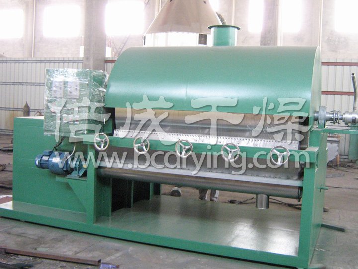 滾筒干燥機(jī)是一種內(nèi)加熱傳導(dǎo)型轉(zhuǎn)動(dòng)連續(xù)干燥設(shè)備。旋轉(zhuǎn)的滾筒通過其下部料槽,粘附著一厚度的料膜,熱量通過管道輸送至滾筒內(nèi)壁,傳導(dǎo)到滾筒外壁,再傳導(dǎo)給料膜,使料膜中的濕得到蒸發(fā)、脫濕、使含濕分的物料得到干燥。干燥好的物料被裝置在滾筒表面的刮刀鏟離滾筒,到置于刮刀下方的螺旋輸送器,通過螺旋輸送器將干物料集中、包裝。