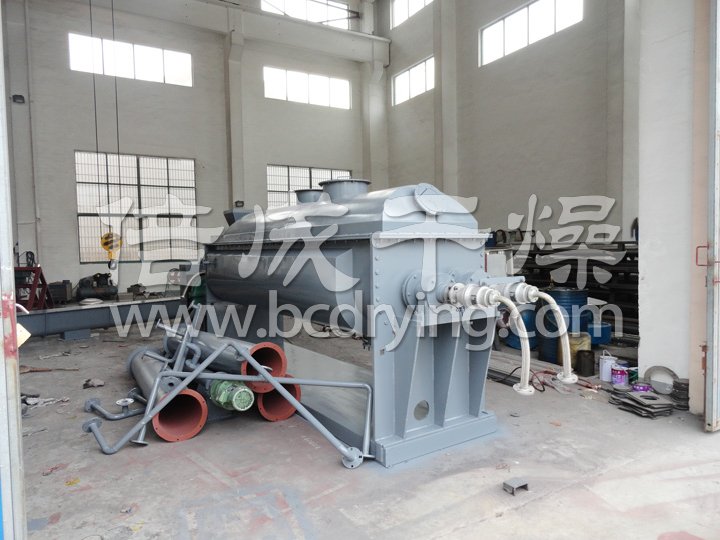 空心軸上密集排列著楔型中空漿葉,熱介質(zhì)經(jīng)空心軸流經(jīng)漿葉。單位有效容積內(nèi)傳熱面積很大,熱介質(zhì)溫度從-40℃到320℃,可以是水蒸汽,也可以是液體型:如熱水、導(dǎo)熱油等。間接傳導(dǎo)加熱,沒有攜帶空氣帶走熱量,熱量均用來加熱物料。熱量損失僅為通過器體保溫層向環(huán)境的散熱。楔型漿葉傳熱面具有自清潔功能。物料顆粒與楔型面的相對運動產(chǎn)生洗刷作用,能夠洗刷掉楔型面上附著物料,使運轉(zhuǎn)中一直保持著清潔的傳熱面。漿葉干燥機的殼體為Ω型,殼體內(nèi)一般安排二到四根空心攪拌軸。殼體有密封端蓋與上蓋,防止物料粉塵外泄而充分發(fā)揮作用。